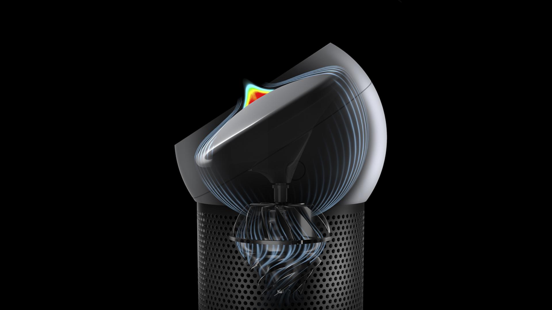 Dyson aerodynamics engineers discovered that when jets of air meet on a convex surface, they converge to create a high-pressure core. By harnessing this phenomenon, they developed a way to project a precise stream of purified air.