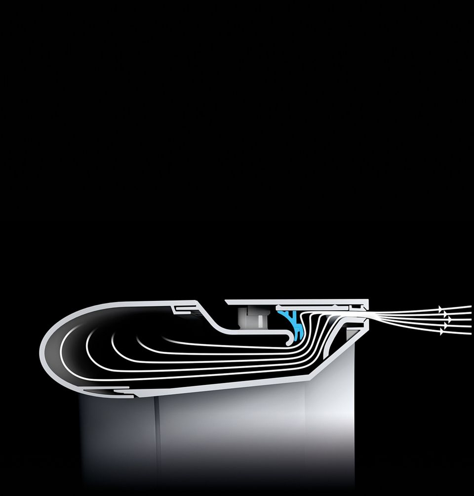 The baffle moves to block the front aperture and diverts air through the rear of the annular at a 45° angle, creating a more diffused airflow. This uses less energy and is quieter because the aperture is wider. Purification effectiveness is still maintained, without the 'draught.'
