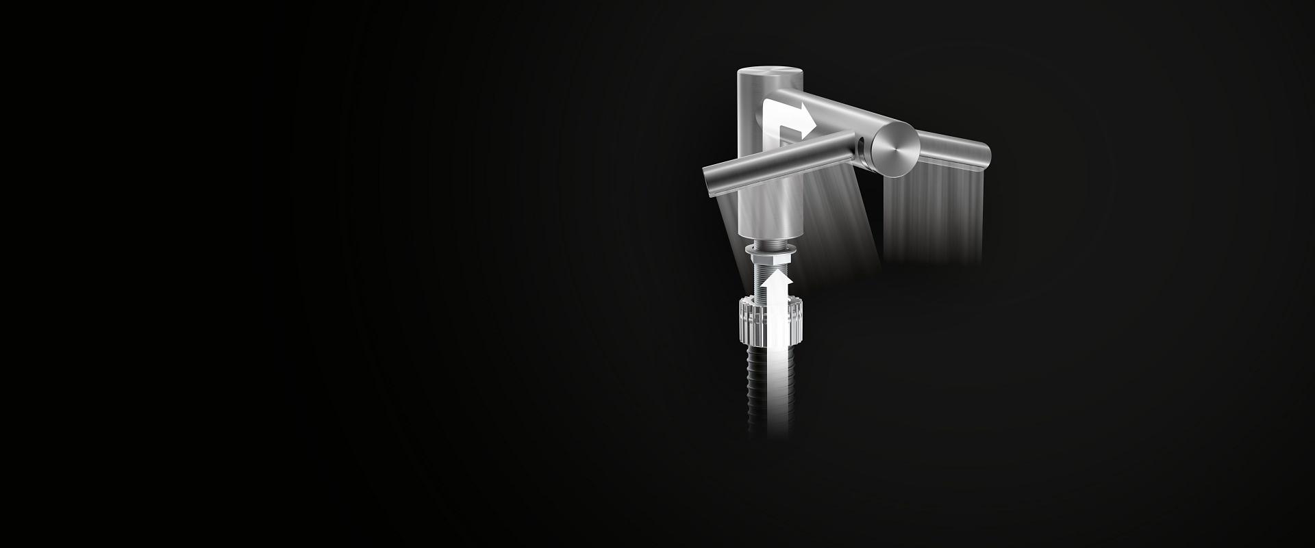 Air from the HEPA filter flows over the electronics, cooling them. It's channeled up the machine by the motor, through air ducts insulated to reduce noise. Sheets of filtered air are then forced at 549 km/h through apertures 0.55mm wide, literally scraping water from hands.