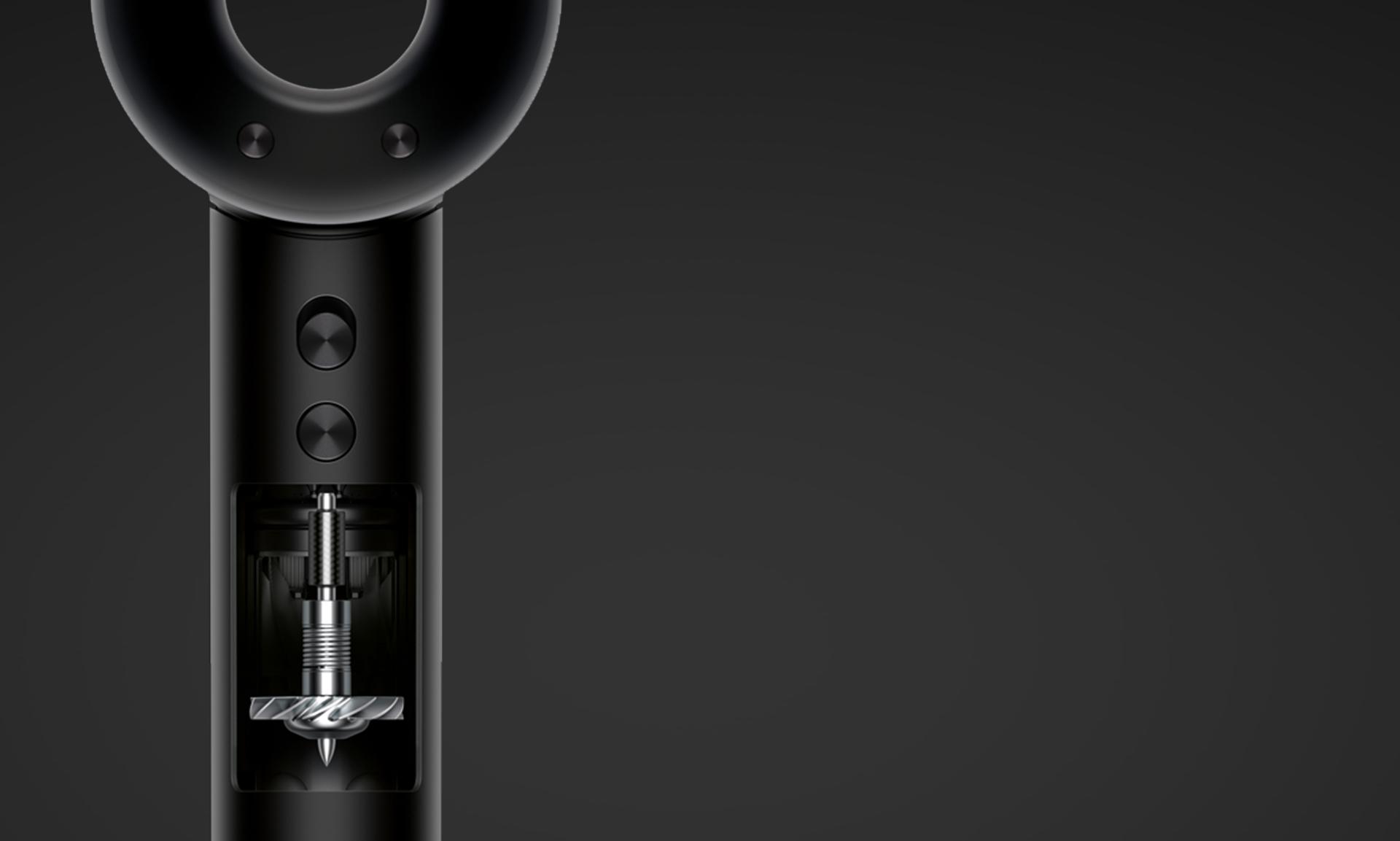 The Dyson digital motor V9 is just 27mm wide, and was created for the Dyson Supersonic™ hair dryer. Housed in the handle to shift the machine's centre of gravity, it spins up to 110,000rpm – on average six times faster than other hair-dryer motors, while up to one third of the weight.1