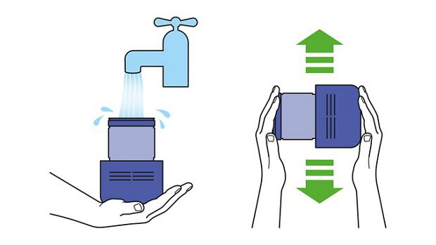 Fill your filter(s) with warm tap water. Cover the open ends with your hands and shake firmly to remove the dirt. Repeat until the water runs clear and then firmly shake the filter to remove all excess water. -