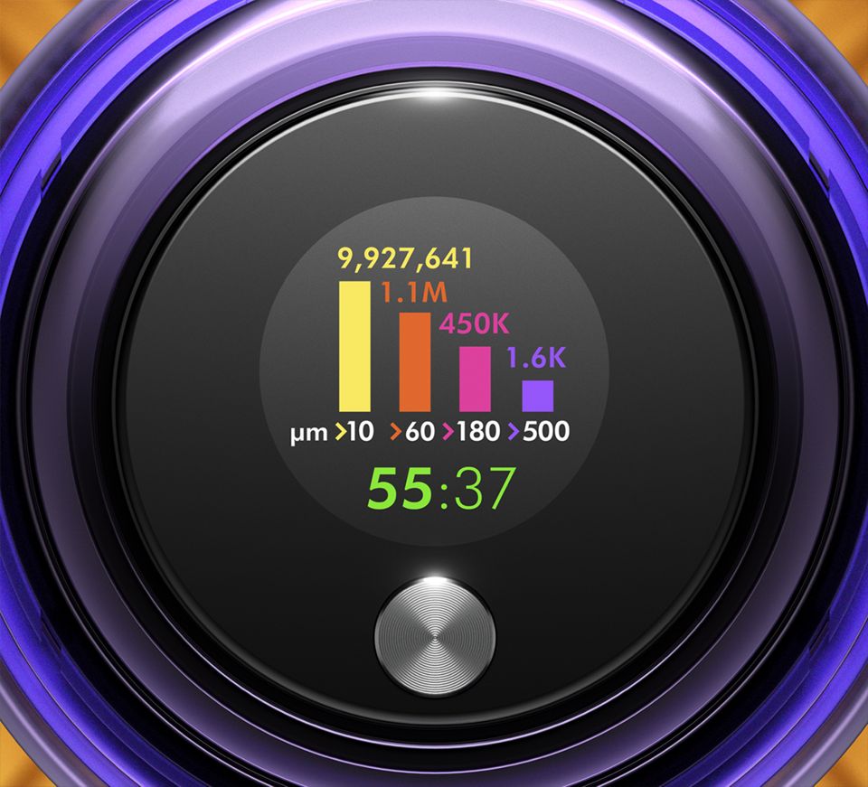 During cleaning, your LCD screen shows the particle count graph, with remaining run time colour-coded to indicate the power mode selected.